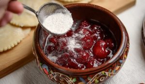 - Вишні без кісточок пересип цукром і крохмалем. Обережно перемішай і дай постояти хвилин 10, щоб крохмаль ввібрав частину соку — так начинка залишиться соковитою, але не втече з вареника.