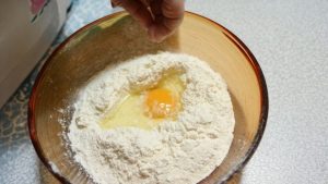 - У мисці змішай яйце, теплу воду, сіль і олію. Поступово додавай борошно й заміси м’яке, еластичне тісто. Воно має бути слухняне, не липнути до рук, але й не дубове. Накрий рушником і залиш “відпочити” на 15–20 хвилин.