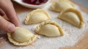 - Розкачай тісто до товщини 2–3 мм, виріж кружечки (склянкою або формою). На кожен поклади чайну ложку вишень, склади навпіл і добре защипни краї — без компромісів, щоб ні крапелька соку не втекла!